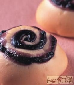 7.将作法6的面糰挤上蓝莓果酱,放入烤箱,以上火200℃,下火180℃,烤焙约12分钟即可。