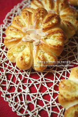 9.然后再将切口两两相对往外翻。放在温暖出进行2次发酵。发酵结束后刷上全蛋液,摆上杏仁片。烤箱预热180度,中层,上下火,13分钟左右。