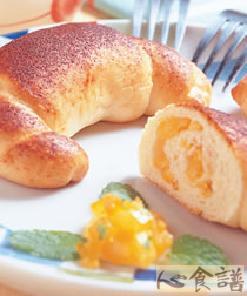 中种面糰:203公克,速溶酵母3公克,水104㏄,主面糰:207公克,细砂糖100公克,盐6公克,全蛋25公克,奶水78㏄,奶油66公克,内馅:适量,装饰:少许,橘皮丝少许