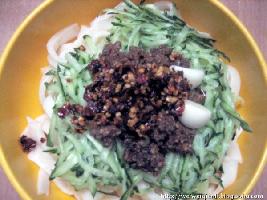 面粉,鸡蛋1个,盐一点,黄瓜丝,肉酱,蒜,辣椒,醋