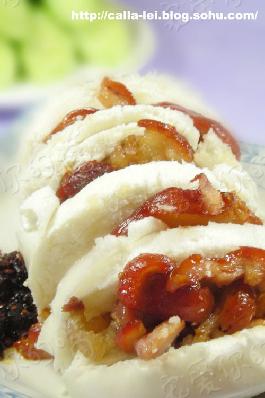 4.馒头切片,夹入蹄膀肉,60秒。吃。我还放了一点老干妈酱,因为俺是无辣不欢滴。不吃辣的人可以用个碟子放点甜面酱,用来蘸黄瓜吃。