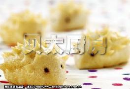 把面揉成圆条,用手罩在面板上将面块旋转、轻揉,制成圆形馒头,再用剪刀剪出“刺”,芝麻嵌上眼睛就是刺猬馒头。