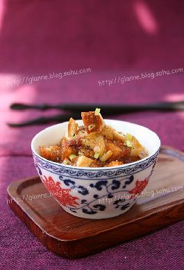 这个菜选用保鲜装的日本豆腐口感非常滑嫩。当然也可以用传统的北豆腐来做,但是豆腐切成小丁后就需要放入加了盐的开水中焯烫一下,馒头可以用早饭吃剩的来做,切馒头丁时可以在刀上抹上一些清水,这样切出的馒头丁即规整,又不会有太多的馒头渣撒落。馒头烤脆后需要尽快食用,时间放长后就会软塌,不好吃了;