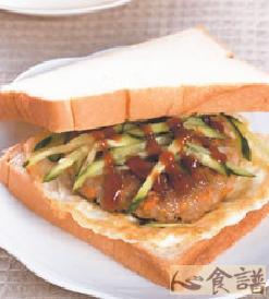 4.将煎好的蛋、肉饼依序夹入土司,再撒上小黄瓜丝、蕃茄酱即可。