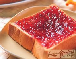 取一片土司,放入烤箱烤至微黄,取出用鉅齿刀,在表面划切成格子状,均匀涂抹果酱即可食用。