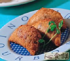 5.将所有白土司修剪成巴掌大的圆形,包入内馅,四周先涂上面煳再对摺成半圆形,用剪刀沿着圆弧处略剪几刀成饺子形,再入锅油炸至酥黄即可。