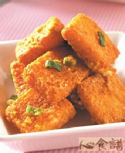 3.烧热油锅,放入作法2的咸蛋黄泥以小火慢炒,炒至膨胀起泡后,放入作法1的土司块拌匀,最后撒上调味料和葱花拌匀即可。