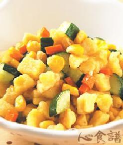 4.在作法3的锅中,加入作法1的其余材料和玉米粒,放入调味料以小火炒2分钟,最后加入作法3的土司丁炒一分钟即可。