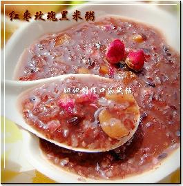 做法:将黑米白米按1:1的比例,洗净,加水浸泡一夜,方便熬煮。将米倒入电饭锅中,加开水熬煮,一定要一次把水家足。图3.等待粥煮开时,将红枣洗净去核,切成丁,玫瑰花苞去蒂,将花瓣分开,备用。粥煮开后,将红枣加入一同熬煮,至米粒涨开,煮至粘稠时,将红糖放入,溶化,起锅前将玫瑰花瓣撒入,搅拌均匀即可。记住了,“煮粥没诀窍,上下三十六搅”,粥煮开后,一定要不时搅拌,以利于受热均匀,并使粥不粘锅
