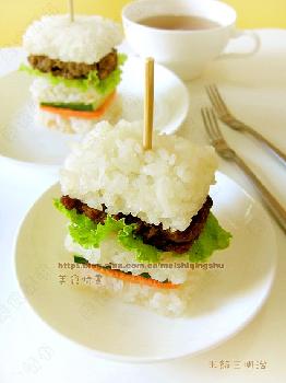 6.最后将米饭和蔬菜、牛肉组合在一起就可以了,用竹签固定。