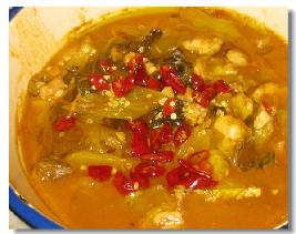 2.锅内底油,把酸菜下入翻炒,加入大料葱蒜片番茄酱,再倒入水煮开,把鱼下入氽熟倒出。