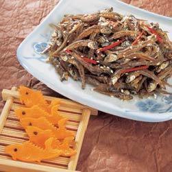 小鱼干480克,花生油或玉米油适量(煎炸用),姜汁酒3汤匙,炒香芝麻1茶匙,麻油1茶匙,红辣椒丝1茶匙,糖3/4茶匙,五香粉1/2茶匙,胡椒粉1/2茶匙
