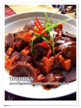 今天又做了一道菜~昨天上午逛书店的时候看到了大长今的美食菜谱,小翻了一下,看到了辣炒年糕,觉得很有趣,最近不知道为什么,对甜辣酱特感兴趣,觉得味道好好哦~前几天和老妈一起逛超市,看到韩式辣酱,差点都要买了,结果被老妈阻止了,说家里的都还没用完,还买~只好作罢~不过,辣炒年糕这道菜还是想试试滴~ 原来一直觉得奇怪,年糕不是甜甜粘粘的吗,怎么可以拿来炒,而且还是用糯米做的,很容易糊锅的~~后来才知道,那是我们南方一带的年糕,而他们那儿的年糕是用米粉做的,没有味道的~其实就是我们这儿的白粿~~上次逛超市的时候正好看到了黑米粿,可是一点都不黑,是紫色的~~~嘿嘿~~ 新的一年,恭祝自己也恭祝大家大红大紫,学习事业更上一层楼~~~