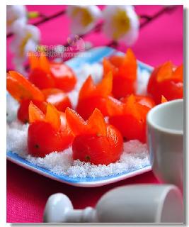 1.把圣女果的一边切下来再切成耳朵的型状,插在上面,做成小兔子的样子。