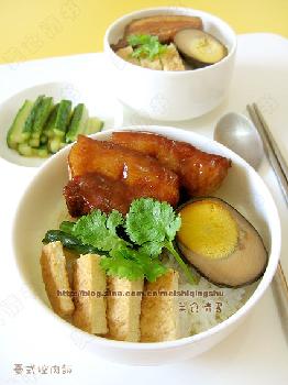 6.最后在米饭上摆上炖好的五花肉、切好的卤豆腐及卤蛋,就可以了,也可以放入些腌好的黄瓜条和萝卜干。至于青菜,可以加在控肉饭中,也可以另做一个青菜小炒~