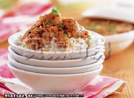 剩余部分的葱末放入1汤匙生抽中搅拌均匀,待煲仔饭上桌时浇入并把肉饼捣碎搅拌均匀。