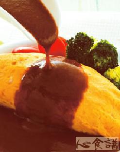 4.将蛋皮覆披于炒饭上,再将蛋包饭移盛至盘中,并趁热取一张餐巾纸用双手将蛋包饭修整成椭圆形,整形完成后,浇上咖哩酱即可。