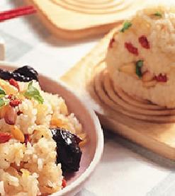 3.热油锅,将洋葱末放入炒软,加入白饭炒至松散,再加入盐、胡椒粉调味,然后将枸杞、松子、酒渍黑枣梅一起加入拌炒均匀后熄火,加入香菜末,将黑枣梅挑出即可。