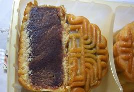 3.)取一份面团压平,包入一颗豆沙球,揉圆放入模型中填平压实,放在桌上敲打一两下,使月饼掉出模型。全部作好之后,即可排入烤盘,表面涂上蛋黄液,放入预热过之烤箱,以摄氏150度烤20分钟即可。