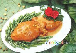4、将效菜炒熟伴在鸭边。取原汁300克,调入所有味料,用湿粉打芡,加尾油和匀,淋在鸭面便成。