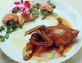 2、八渡笋涨发后切丁,加入各种辅料,调入基本味,用鸡油焖透,酿入鸭腹中,将鸭颈打结,飞水后用老抽上色,入油锅炸至表皮呈金黄色捞起。