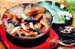 3、炒锅烧底油烧至六成热,下入剁椒、姜片大火煸至油红,下鸭块炒至变色,放入槟榔,烹料酒,放酱油、盐、味精、高汤中火煨6分钟至熟透,加入尖椒,装入干锅即成。