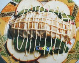 在鸭脯肉中放入盐、胡椒粉等调料腌制后煮至成熟,盘子中间放紫甘蓝丝、胡萝卜丝、花生,边上放苹果片再用酸黄瓜点缀,最后挤上沙拉酱拉成网形,食用时浇上用圆葱碎、酸黄瓜碎、苹果碎、马乃司兑成的汁即可。