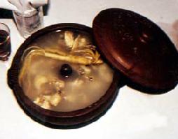 8.取出去掉姜、葱、蚬鸭的胸骨、锁喉骨,撇去汤面浮沫,加盖入蒸笼用中火再炖约1小时便成。
