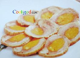 2、咸蛋黄切成条,用腌好的光鸭卷成卷,加细纱布包好,扎紧;