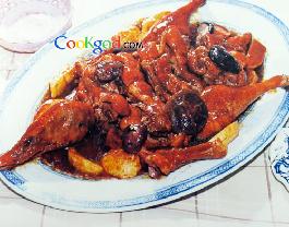 5、将鸭肉取出、按原形摆入盘内,土豆块围摆在鸭子的周围。锅内汤汁用大火收浓,加入味精、胡椒粉,用湿淀粉勾芡,出锅浇在盘内鸭子、土豆块上即成。