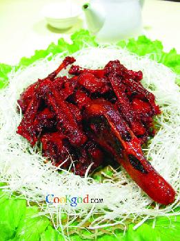 卤水的制作 锅入清水3千克烧开,放香料包(红曲米15克,八角、小茴香、香叶各80克,罗汉果2个,桂皮、草果各20克,甘草10克),大火烧开后加50克北京牛栏山高度二锅头小火滚1小时即可。此卤水的制法简单,因为卤出来的鸭子不直接食用,此步加工只是增香,还要继续烹制给鸭子上色定味,方可味道香郁。鸭子不要全部斩成件,为提高出菜速度,可以先将鸭子卤好,入冰箱中保存,再根据客人的要求改刀。