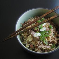 切块烧鸭235克,鸭皮和鸭脂肪分开,放到一边,切细片叉烧80克,香葱6根,切细片,酱油30毫升,鸡蛋2只,打散,煮好的米饭475克,盐和胡椒适量