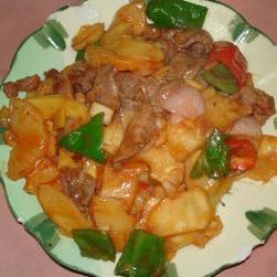 4.余油倒出,利用镬中余油,下蒜茸、洋葱、辣椒块爆至出香味,将子姜片、菠萝放在镬中炒热后,加入鸭片, 用芡汁勾芡,最后淋油5毫升,炒匀上碟便可。
