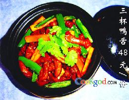 鸭舌250克。调料青、红辣椒段各100克,干海椒20克,葱段、香菜各30克,香菜叶5克,三杯汁80克,炸蒜子10克,色拉油、潮州卤水各800克。