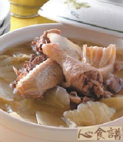 2.外锅放1杯水(材料份量外),电锅内锅放入作法1的鸭肉块、姜片及水,煮至开关跳起。
