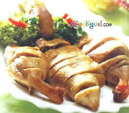 3、填鸭冲去花椒盐,放入调好的白卤水中,卤制4小时,取出冷却后,改刀装盘即可。