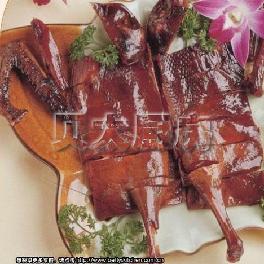 麻鸭挂入炉中烘烤时,一定要掌握好火候,并将鸭身在烤盘中翻动几次,使之受热均匀。