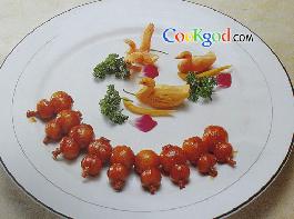 1、鸭脖洗净,将皮取下,中间塞入拌好的糯米粉,制成葫芦形,上笼蒸熟,摆入盘中。