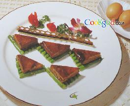 1、嫩鸭宰杀去毛、内脏,焯水沥干,用酱油、味精、糖卤制成熟。