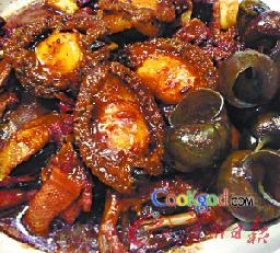 田螺常配以紫苏和豆豉炒制,是中秋前后的美味小食,但以田螺焖煮鸡或鸭,亦为一种特色吃法。广西菜里有一道田螺焖鸡,以镬仔煮或沙窝焖,甚为滋味。鲍鱼的品种多样,以鲜鲍较为常见,在海鲜市场均能购买到。鲍鱼与田螺都含有蛋白质、铁、钙和维生素A等营养,取鸭与其共烹,浓郁、甘鲜且美味,为一道本季节的滋补食馔