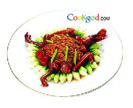 4、锅内放入色拉油,烧至七成热时加入压好的鸭子和压制鸭子的汤汁大火烧开,放入豆面小火翻炒3分钟,加入糖、胡椒粉、生抽、蚝油调味后,放西芹段,浇剩余的明油出锅,摆在汆水后的油菜芯上即可。