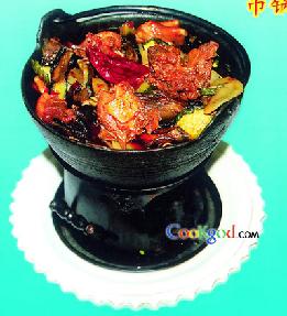 2、锅里放入豆油烧至七成热,下入葱段、姜片、八角、干辣椒小火炒香,放入鸭块中火煸炒8分钟至水分将干时加入秘制酱翻炒1分钟,加入高汤、盐烧开倒入高压锅中,中火压15分钟,将其倒入锅里,加入茄子干、土豆干、黄瓜干、香菜段,小火煨3分钟,改大火收汁至汤浓时加入味精调匀,放蒜片后倒入吊锅里上桌,食用时点燃酒精炉即可。
