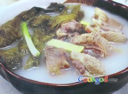 2、取净锅上火,放入清水、姜、老鸭、酸菜,大火烧开转中火煲45分钟调味即成。