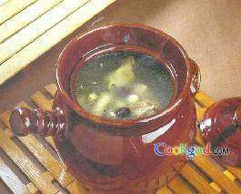 陈皮用温水浸泡去涩味,光老鸭斩成“日”字小块,焯水,取煲汤砂锅,放入各种主配料,加入料酒,注入二汤,旺火烧开,转小火煲2小时至鸭肉酥烂,调味,旺火烧沸,原锅上席。