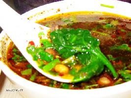 3.放入香芹、菠菜,加湿淀粉勾芡,然后撒上炒熟的黄豆,加入一小勺辣椒油,一大勺醋,少许味精即可~~