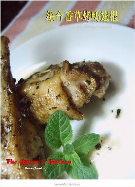 2.鸭腿加入混合的香草、柠檬皮丝、2-3片的柠檬肉、橄榄油、少许盐、蒜、葱、薄荷叶八角一个(掰开)适量黑胡椒粉混合搅拌均匀放入冰箱腌12-24小时。