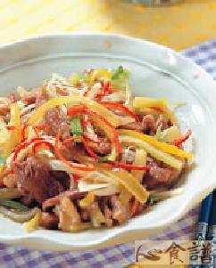 3.起油锅,爆香葱丝、姜丝、辣椒丝后,倒入作法2鸭条及全部调味料,大火翻炒数下即可。