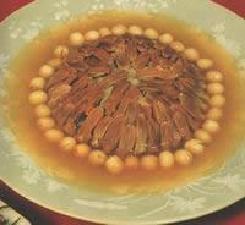 5.把已蒸好的虫草鸭舌翻扣入大盘内,熟莲子镶在鸭舌四周,倒入特制鸭汤(鸭子、排骨作它用)即成。