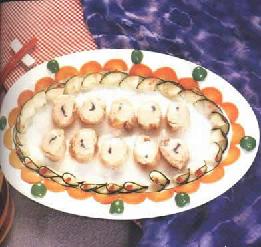 2、将炊熟的烟筒卷放在砧板上切成件,摆放在盘间,再将上汤放进鼎里,加入味精、精盐、胡椒粉,用生粉开清水勾芡,最后加入麻油、熟猪油,淋在鸭筒卷面上即成。