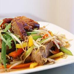 烧鹅(鸭)1斤左右,切件块,青葱3根,去白,切丝,蒜蓉1汤匙,中洋葱1个,去皮,切丝,三色椒各半个,切丝,芽菜350克,去尾,油1汤匙,盐1/3茶匙,汁料:(份量只供参考),海鲜酱1汤匙,蚝油2汤匙,水3汤匙